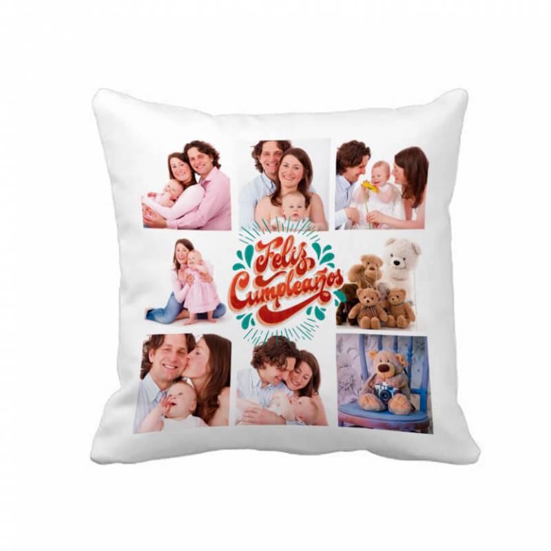 Cojín de poliester personalizado de 40 x 40 cm. Estampación a todo color de 40 x 30 cm. Apto para lavadora.